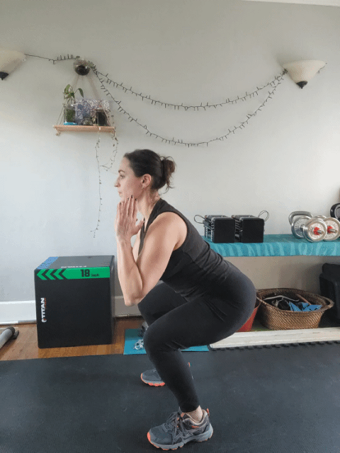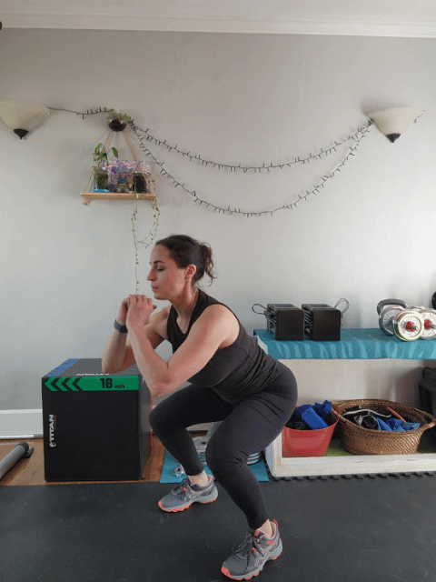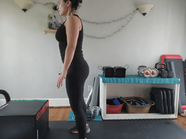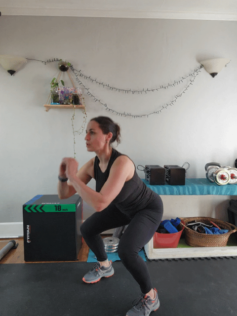 Beginner (Modified Burpee): Skip the jump, and instead, squat down, place your hands on a sturdy chair, a step, or a plyo box and step one foot back in at a time into a plank. Step your feet back in and stand up tall. Move at a steady pace while focusing on form.