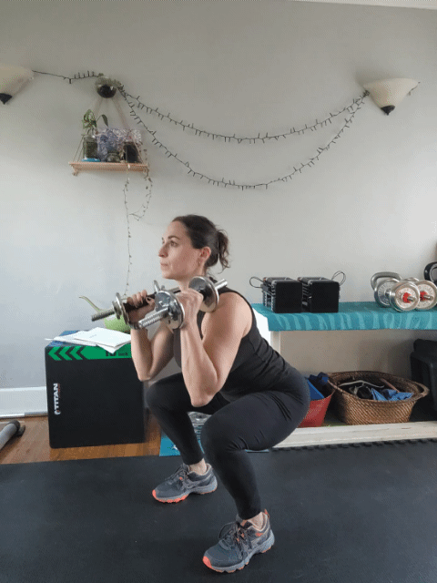 Beginner (Bodyweight or Lighter Weights): Perform the same movement without weights or use very light dumbbells. If needed, keep your squat range shallower and focus on squeezing the chest as you bring the arms together. Maintain control throughout to build strength safely.