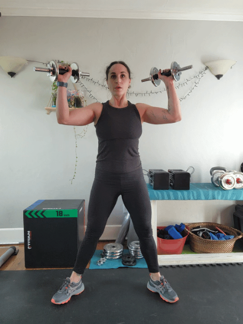 Intermediate (with Dumbbells): Hold a dumbbell in each hand at shoulder height, feet hip-width apart. Lower into a squat, keeping your chest up and weight in your heels. As you stand back up, press the dumbbells overhead, fully extending your arms. Lower the weights back to shoulder height and repeat.